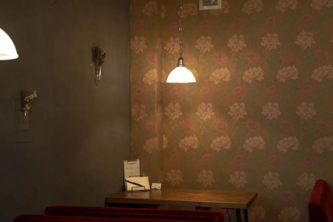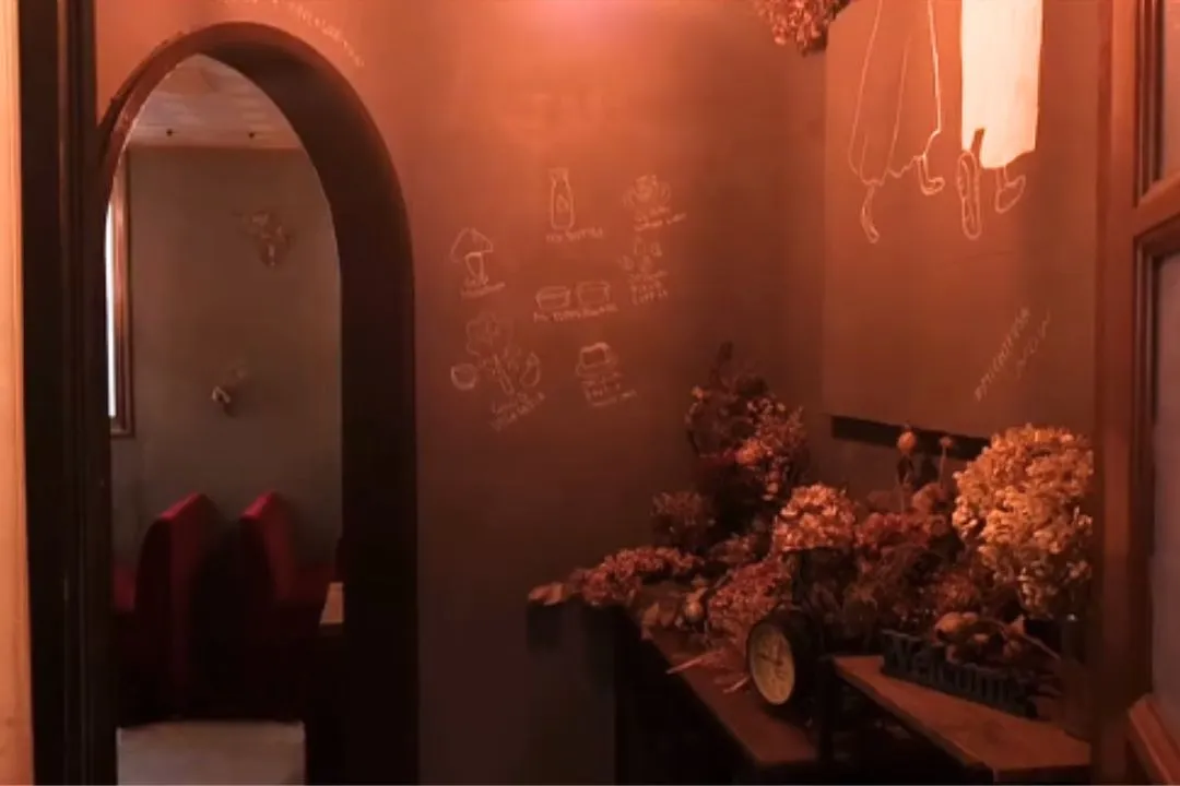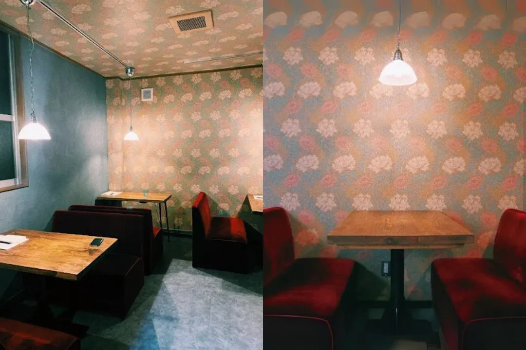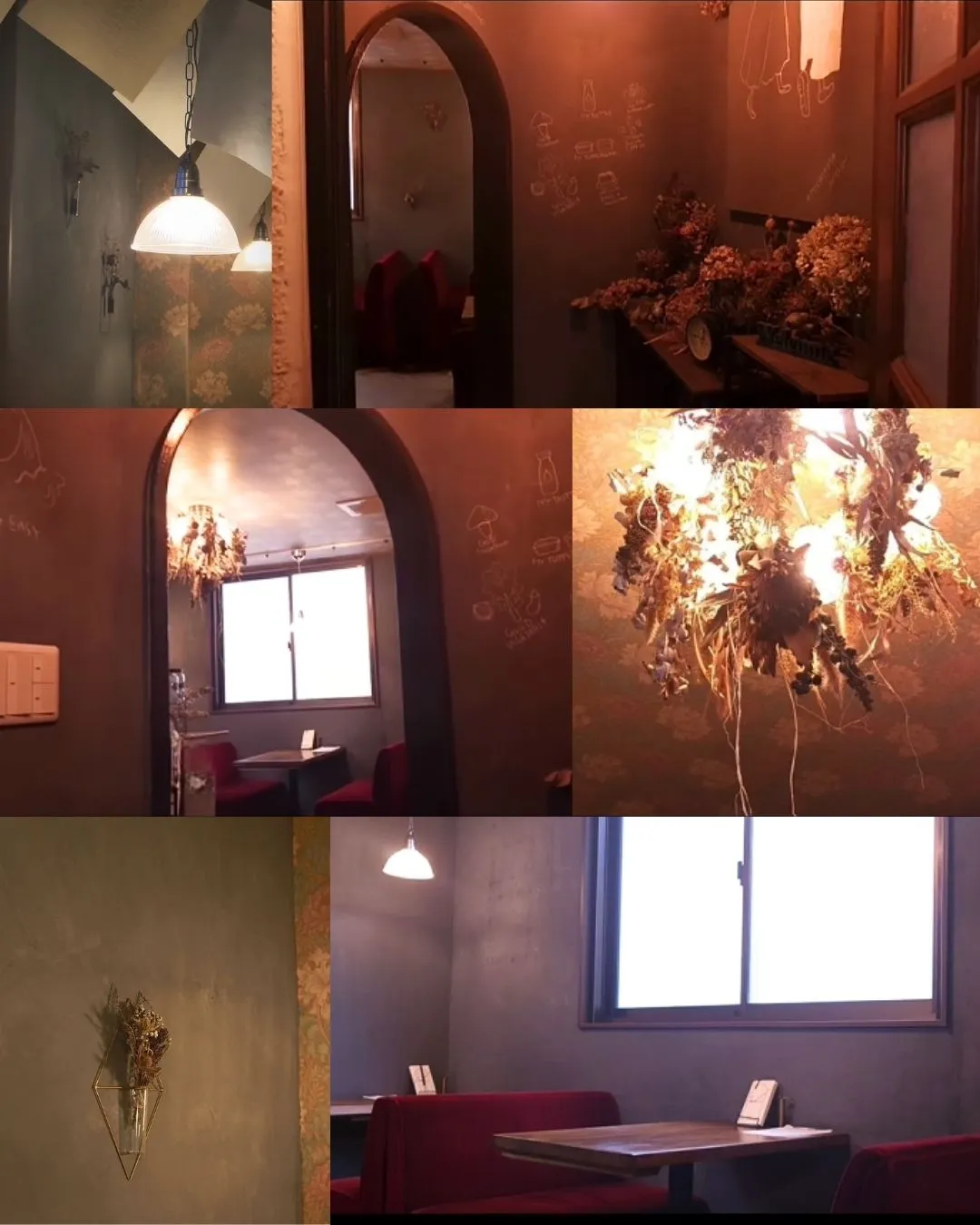 シックで落ち着いた店内には、ドライフラワーや深紅のソファ、シャンデリアの柔らかな灯りが広がり、まるで物語のワンシーンに迷い込んだような空間です。